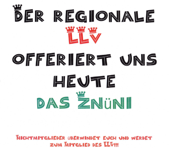 - Wettbewerb für LLV-Mitgliedschaft: Nichtmitglieder dürfen an der GV oder einem Apéro ihren Namen auf einen Zettel schreiben und jemand wird ausgelost und gewinnt eine Jahresmitgliedschaft (oder einen Teil davon), diese wird von der RO bezahlt