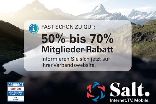Exklusiv für LLV-Mitglieder können wir attraktive Mobiltelefon-Abos bei Salt mit dauerhaften Rabatten anbieten. Mit dem Mitgliederrabatt von 50 bis 70% erhalten LLV-Mitglieder günstige Preise bei drei verschiedenen Salt-Mobile-Abos.